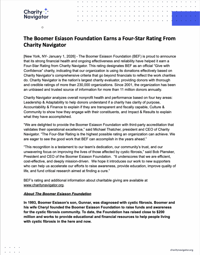 Please note, the Boomer Esiason Foundation is recognized as a tax-exempt charitable organization under section 501(C)(3) of the Internal Revenue Code.